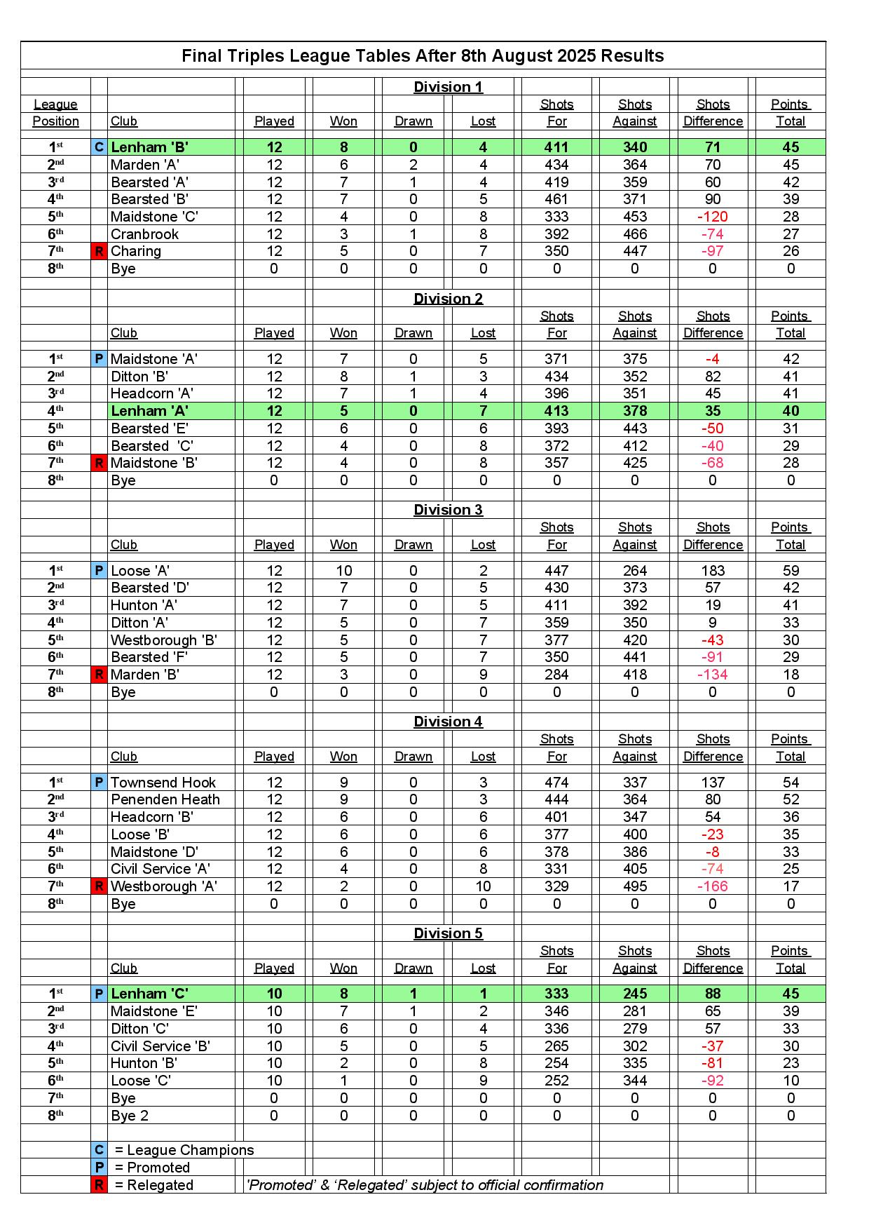 Maidstone Triples League Tables
